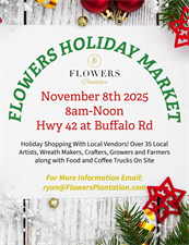 Come start this years Holiday Shopping with our local vendors at the Flowers Plantation Market. This market will host over 35 vendors with a variety of arts, crafts, woodworkings, baked items, farm fresh meats, and much more. Intersection of Hwy 42 and Buffalo Rd in Flowers Crossroads